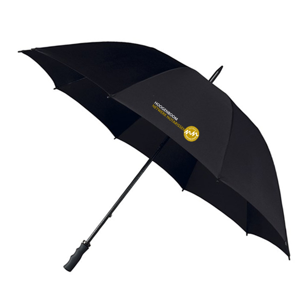 Zwarte paraplu met kantoorspecifiek logo op 1 segment. Per 10 stuks te bestellen.
